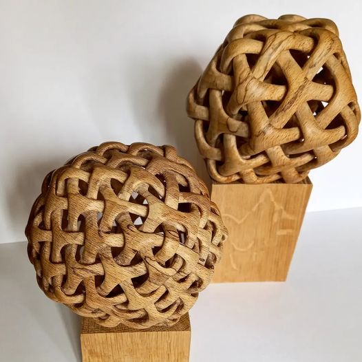This month I have finally finished a project I started many years ago and I wanted to share a picture of the two pieces that both sprung out from the same basic question. That question was: “Can I weave two (or three) dodecedrons into each other such that it preserves the five-fold rotational axes of symmetry of a single dodecahedron?” The answer is No, I cannot (yet), but in the process of trying to answer it I discovered something else entirely, and then by extrapolation (from a rhombic dodecahedron to a rhombic tricontahedron) yet another thing. Those two things I call Triaxiallia 12 and Triaxialla 30 respectively, and are developed from the nets you see in this image below.
