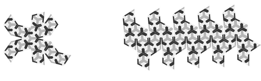 You can see how the same rhombic tile is repeated to form a continuous pattern over the polyhedron, but the eagle-eyed among you may notice that the edges don’t always quite link up. As a result, 6 of the faces of Triaxiallia 30 have a different weaving pattern, that allowed me to preserve quite a lot of symmetry and allow the cage-like structures to adhere to a over-under-over-under weaving pattern across the entire surface. Sometimes they come together as 4 lines rather than 3, and as your eye is drawn round it presents a nice little diversion every so often. This is a natural consequence of taking a pattern that can tile a 2D place and wrapping it round a 3D object, and although its note quite what I had in mind, I was very pleased when I discovered it!